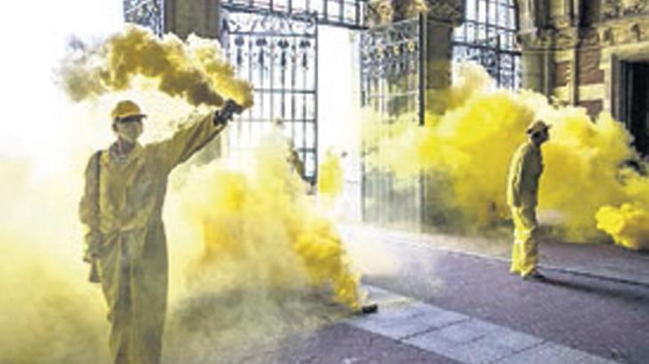 Amsterdam’daki Rijksmuseum Müzesi, Extinction Rebellion (XR) grubundan sarı tulumlar giyen ve yüz maskeleri takan aktivistlerin sarı duman bombaları patlatıp kendilerini girişlere zincirledikleri eylem yüzünden kapatıldı.