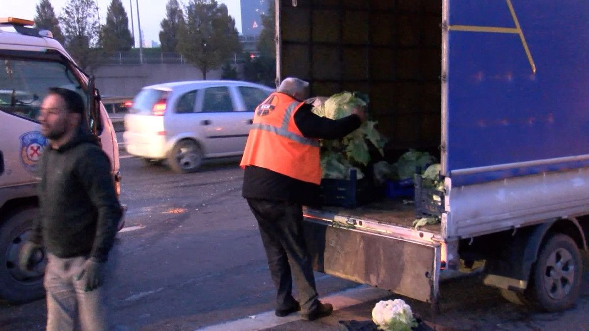 Yola saçılan sebzeler görevliler tarafından temizlenirken yan yatan kamyonette sağlam kalan sebzeler de başka bir araca taşındı.
