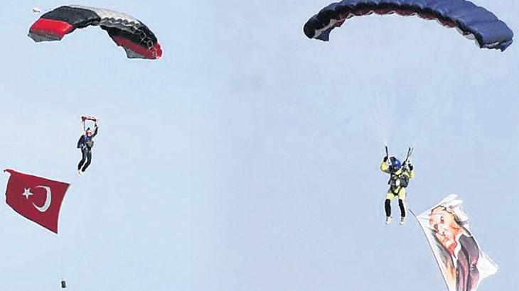 İzmir’de düzenlenen TEKNOFEST’in ikinci gününde de ziyaretçi akını sürerken sabahın erken saatlerinde başlayan gösterilerde Türk Hava Kurumu paraşüt eğitmenlerinin Atatürk posteri ve Türk bayrağı açtıkları atlayış beğeniyle izlendi.