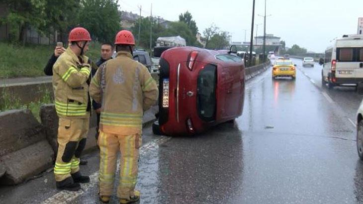 İstanbul Kartal’da yolda oluşan su birikintisine giren otomobil, sürücüsünün direksiyon hakimiyetini kaybetmesi sonucu beton bariyerlere çarparak devrildi.