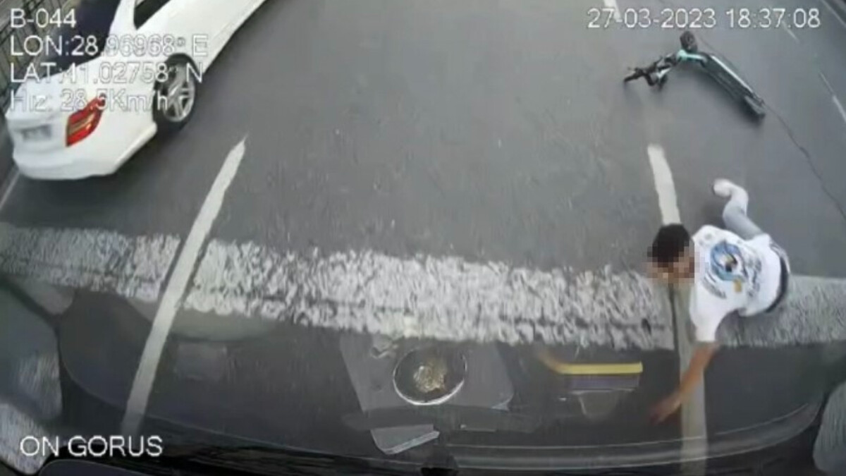 Şişhane’de elektrikli scooter ile seyreden iki genç tehlikeli hareket yapınca yola savruldu, şoförün refleksi kurtardı.
