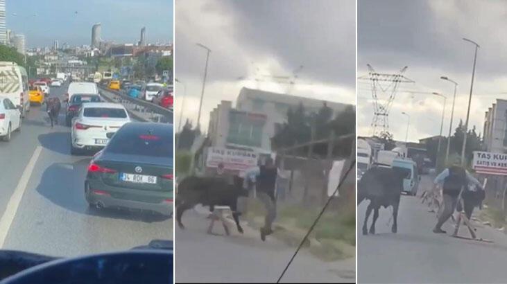 Ataşehir’de sahiplerinin elinden kaçan kurbanlık hayvanlar, ortalığı birbirine kattı. Kaçan boğanın yakalanmaya çalışılması ve başka bir kurbanlık hayvanın trafikte araçların arasında ilerlemesi cep telefonu kamerası ile görüntülend